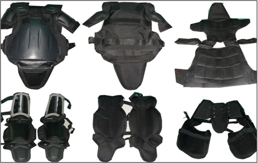 Elbow and shin guards ergonomically moulded with Ribs to protect limbs during riot/mob situation.